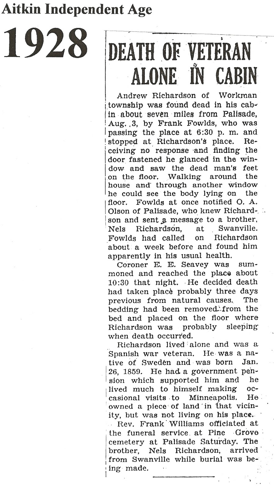 Yesterday (within 24 hours), I got an email reply from Aitkin County Historical Society with an obituary of Andrew Richardson attached to it. What a joy! Answers to my questions, yes, Andrew was a Spanish-American War veteran.